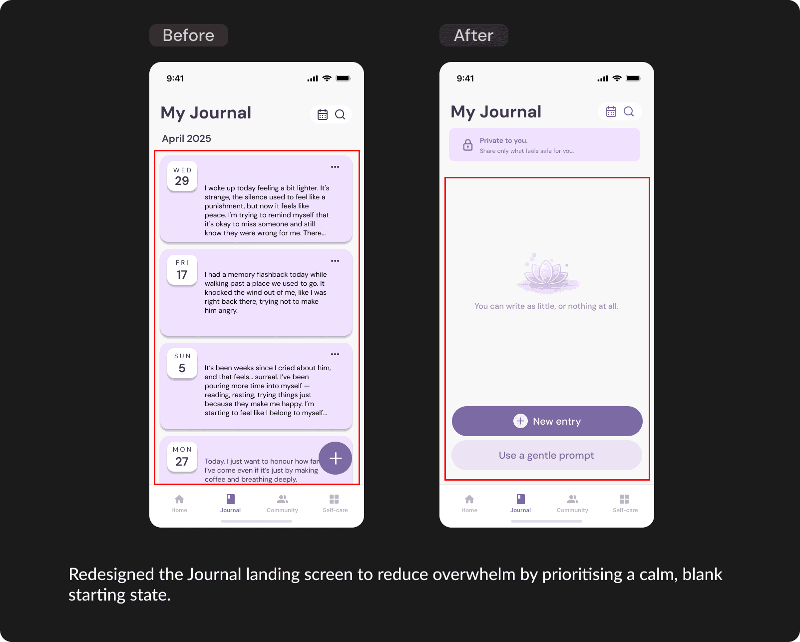 I learned that trust is strengthened when privacy is communicated directly in the interface, not hidden in settings. By adding clear privacy cues (e.g., “Private to you”) and surfacing content controls where users need them most (Journal and Community), Bloom feels safer, clearer and more reassuring to use.