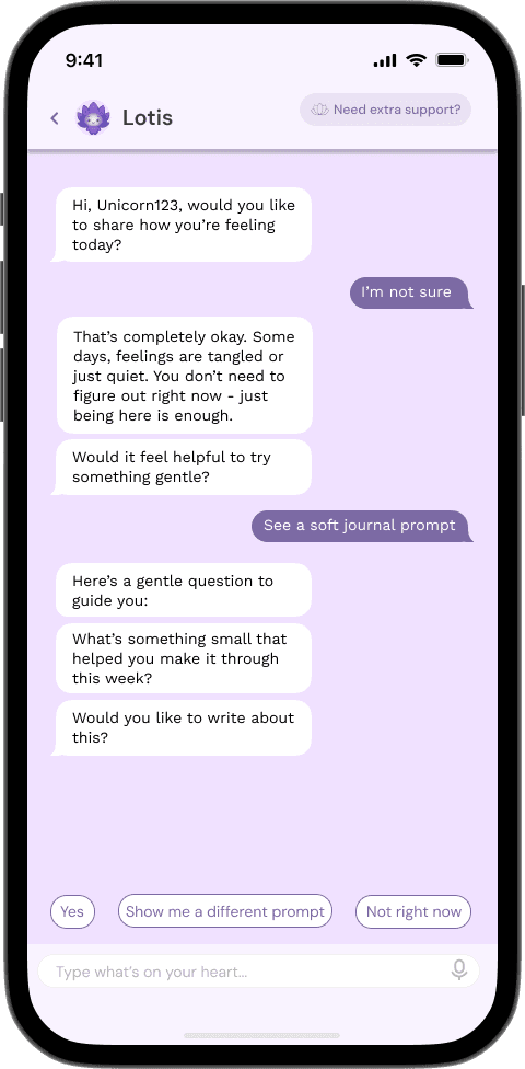 Lotis is a gentle support companion that validates how you feel and offers grounding or optional prompts without acting like a therapist. You stay in control, you can pause or skip at any time and Lotis can point you to further support if you need it.