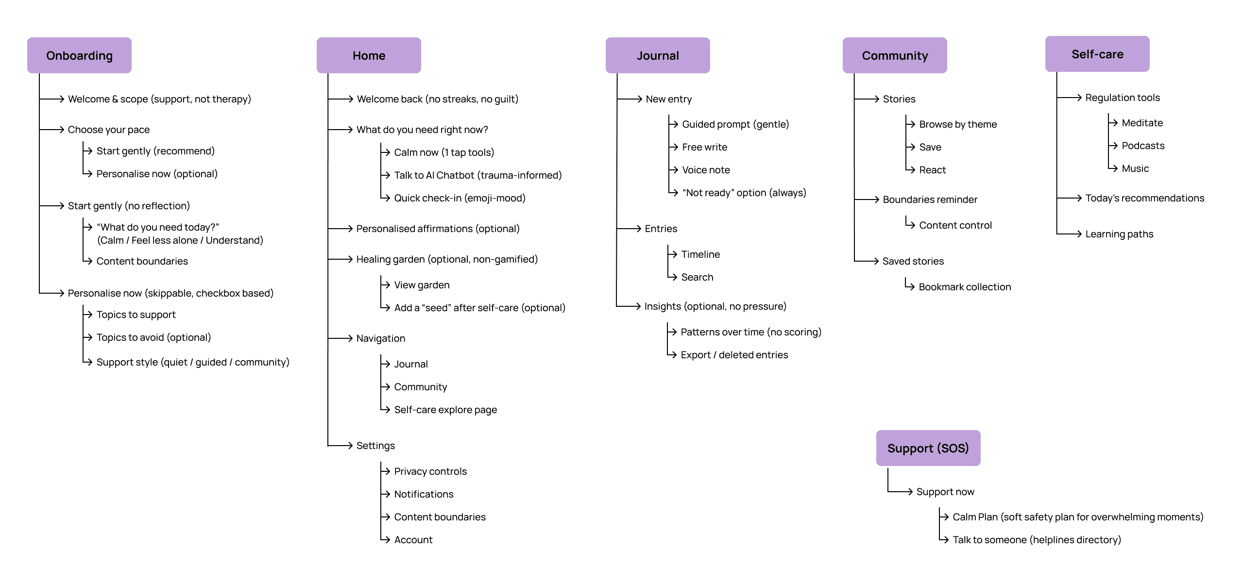 Based on my research insights, I translated survivors' key needs: safety, autonomy and low-pressure support into a trauma-informed user flow that structures Bloom around gentle entry points, clear boundaries and choice-led navigation.
