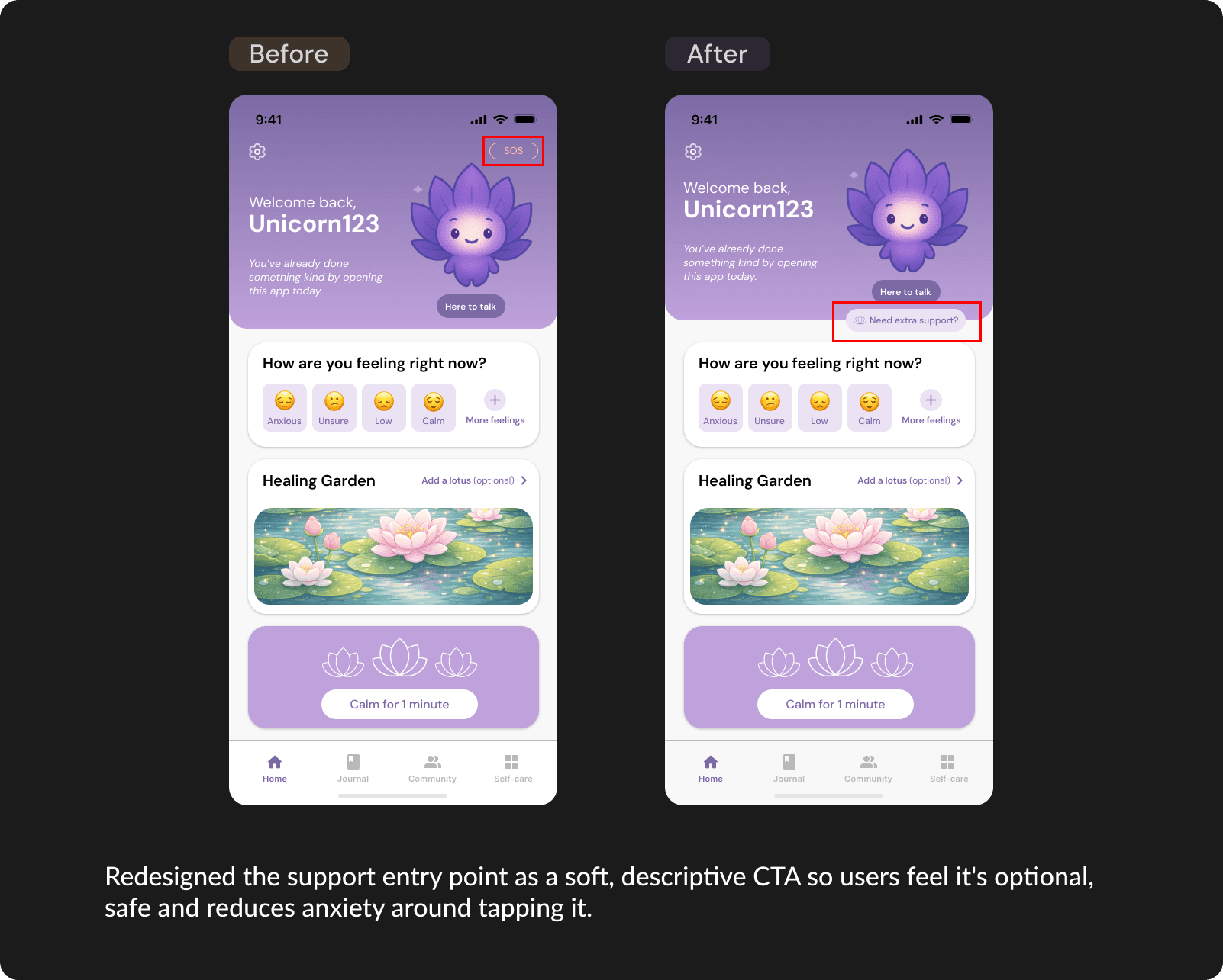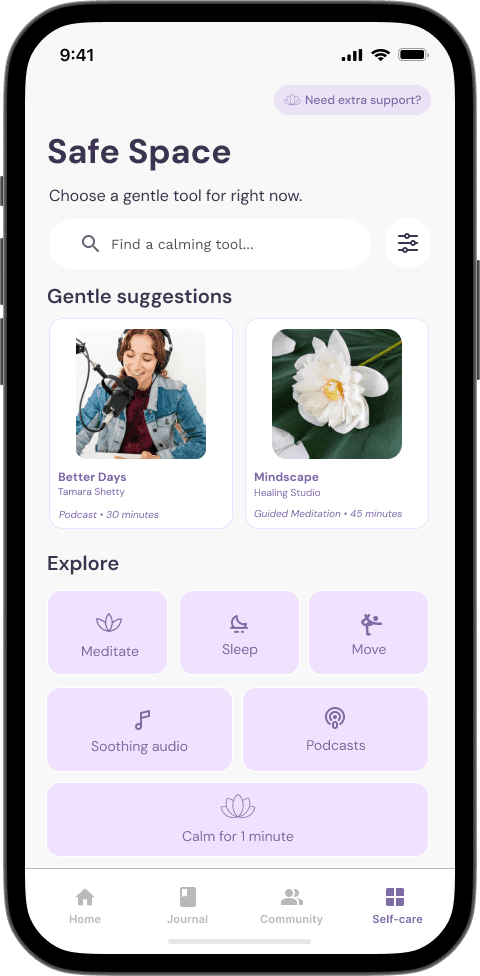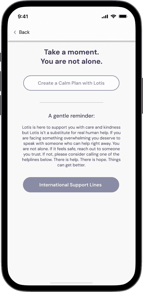 An always-available support entry designed to feel safe to tap. Users can self-soothe with Lotis or connect to helplines in a single step.