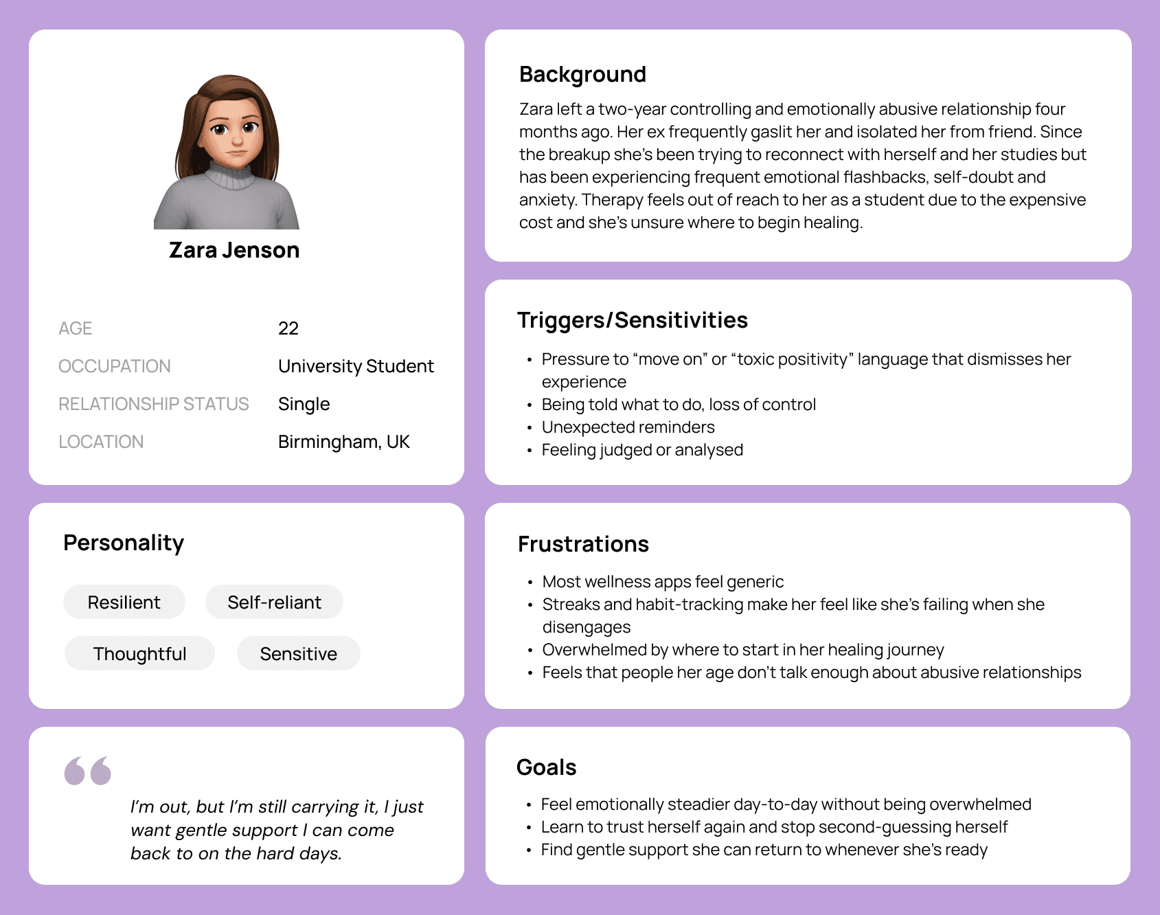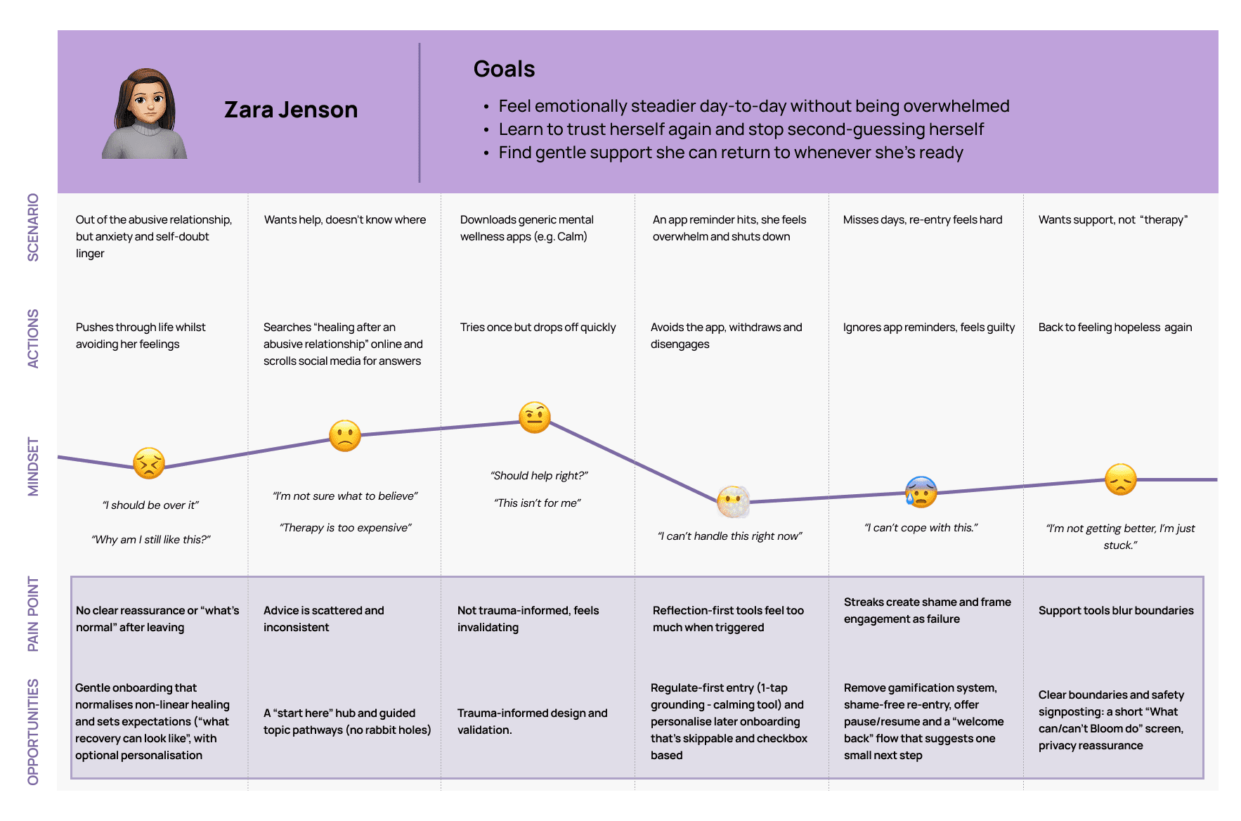 Drawing on my research findings, I created Zara’s persona and journey map to capture the emotional reality of post-abuse recovery and highlight where current tools fail to meet survivors’ needs.