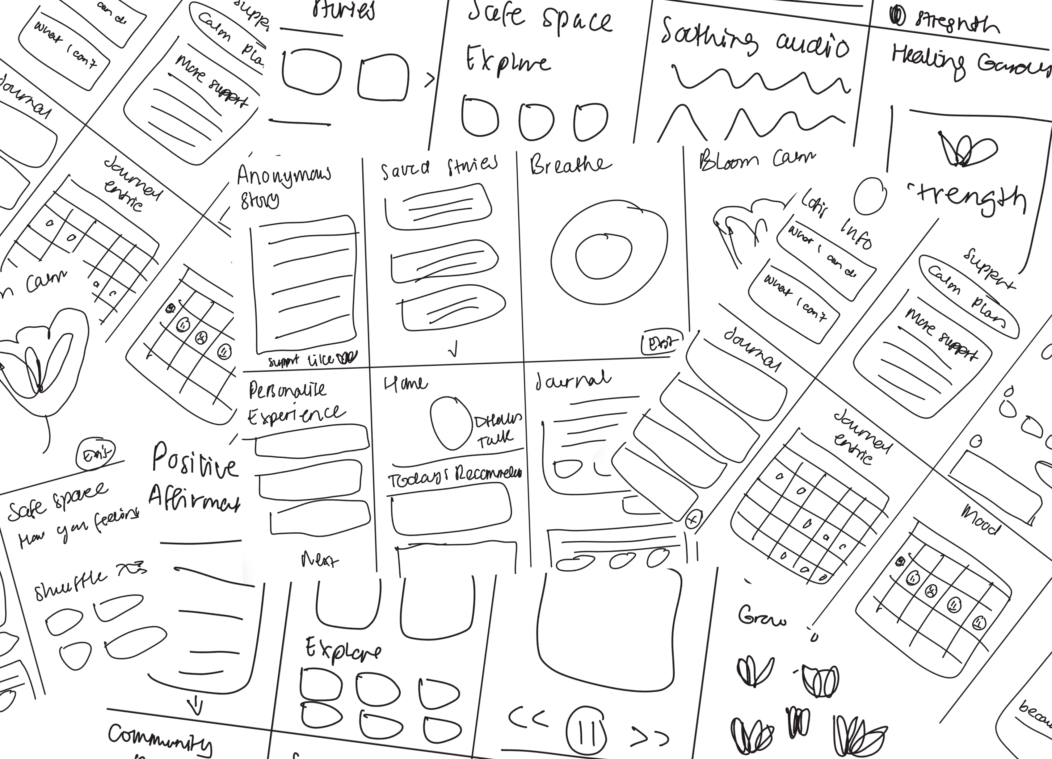 I used the Crazy 8s ideation sprint to generating quick, low-fidelity variations of key screens, exploring multiple ways Bloom could support survivors without increasing pressure. This helped me test different interaction patterns and identify the directions that felt most calm, optional, and safe to engage with.